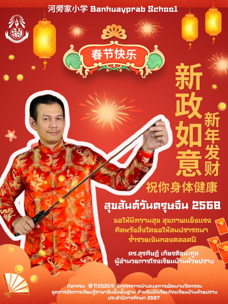 29 มกราคม 2568 โรงเรียนบ้านห้วยปราบ โดย ดร.สุรศิษฎ์ เกียรติธนะกูล ผู้อำนวยการโรงเรียน นางสาวเพ็ญนภา ปิตะเวสัง รองผู้อำนวยการโรงเรียน คณะครูและบุคลากรทางการศึกษา เข้าร่วมพิธีเปิดกิจกรรม 春节2025年 นิทรรศการนำเสนอการพัฒนานวัตกรรม ชุดการจัดการเรียนรู้ภาษาจีนขั้นพื้นฐาน สำหรับนักเรียนโรงเรียนบ้านห้วยปราบ ประจำปีการศึกษา 2567 (วันตรุษจีน ปีที่ 5) โดยมีกิจกรรมดังต่อไปนี้ การแสดงนักเรียนชุมนุมประถมอินดี้แดนซ์ 苏幕遮 การกล่าวสุนทรพจน์จีน โดยตัวแทนนักเรียนชุมนุมภาษาและวัฒนธรรมจีน 我来自河旁家小学 การเขียนพู่กันจีนคำมงคลโดยคณะผู้บริหาร ลงในหนังสือแบบฝึก YCT Standard Course สำหรับการทดสอบภาษาจีนระดับประถมศึกษา เพื่อเริ่มต้นศักราชใหม่ การเดินแบบชุดวัฒนธรรมจีนโดยคณะครู 老师走秀 นิทรรศการวัฒนธรรมจีนโดยคณะครูและนักเรียน ณ โดมอเนกประสงค์ โรงเรียนบ้านห้วยปราบ