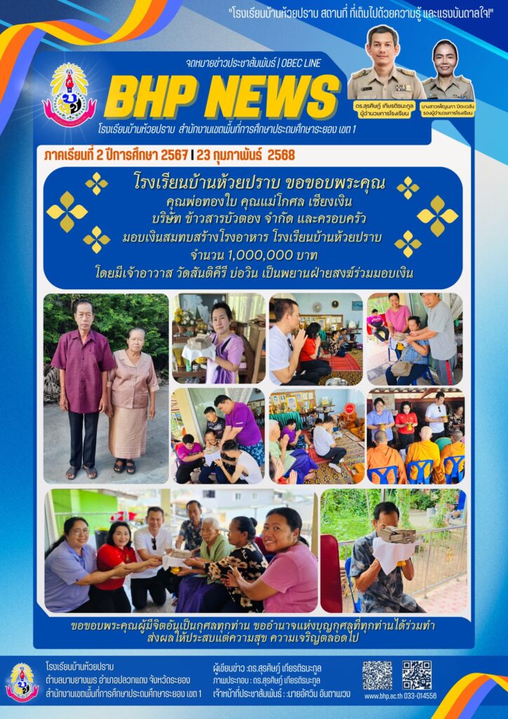 วันอาทิตย์ที่ 23 กุมภาพันธ์ 2568 โรงเรียนบ้านห้วยปราบ โดย ดร.สุรศิษฎ์ เกียรติธนะกูล ผู้อำนวยการโรงเรียน เข้ารับมอบเงิน จาก คุณพ่อทองใบ คุณแม่โกศล เชียงเงิน บริษัท ข้าวสารบัวตอง จำกัด และครอบครัว มอบเงินสมทบสร้างโรงอาหารโรงเรียนบ้านห้วยปราบ จำนวน 1,000,000 บาท โดยมีเจ้าอาวาสวัดสันติคีรี บ่อวิน เป็นพยานฝ่ายสงฆ์ร่วมมอบเงิน ขออนุโมทนาบุญกุศลในครั้งนี้ จงดลบันดาลบุญให้ท่านและครอบครัวจงมีแต่ความสุข เจริญรุ่งเรือง ก้าวหน้าในชีวิต มีโชคลาภ มีสุขภาพดี แข็งแรง อายุยืนนาน ปราศจากศัตรูผู้คิดร้ายและภัยตรายทั้งปวงขอให้บุญกุศลจากการทำบุญ จงพบแต่ความสุขความเจริญคิดจะทำการสิ่งใดขอให้สมหวังตั้งใจทุกประการด้วยเทอญ….